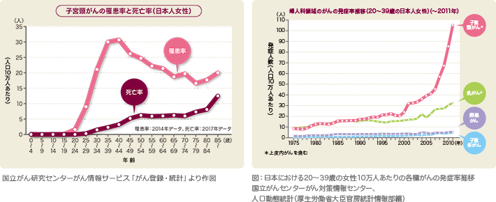 近年では20代後半から30代に急増、若い女性の発症率が増加傾向にあります。子宮頸がんは、女性特有のがんの中では乳がんに次いで第2位を占めており、特に20代から30代の女性においては、発症するすべてのがんの中で第1位となっています。