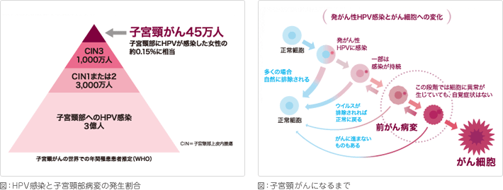 ※2ため、子宮頸がんに進展するのはごくわずかです。全世界で毎年3億人の女性から子宮頸部へのHPV感染がみつかると仮定した場合、そのうちの約0.15%が子宮頸がんを発症すると推定