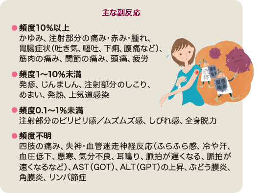 なお重い副反応として、まれにショックまたはアナフィラキシー様症状を含むアレルギー反応、血管浮腫が認められることがあります。また急性散在性脳脊髄炎(ADEM)やギラン・バレー症候群があらわれることがあります。詳しくは医師にご確認ください。